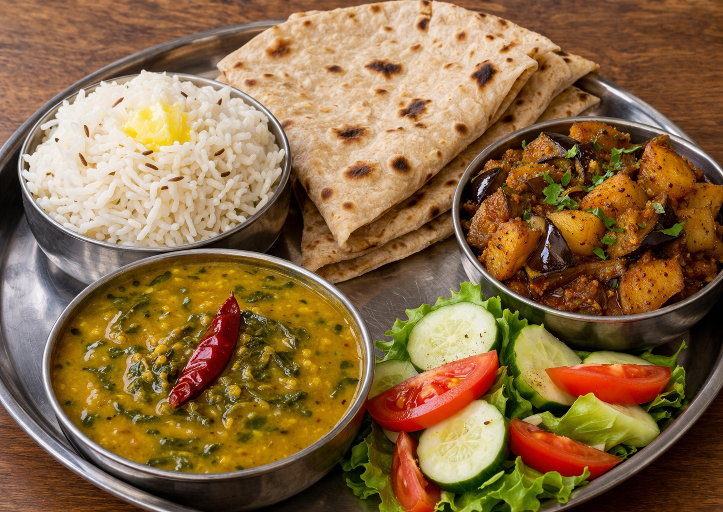 A satisfying plate of Dal Palak and Baingan Aloo, served with Ghee Rice, 3 Chapati, and Salad.