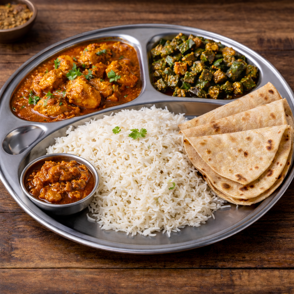Chicken Masala, Bhindi Masala, Plain Rice, 3 Chapati, Pickle