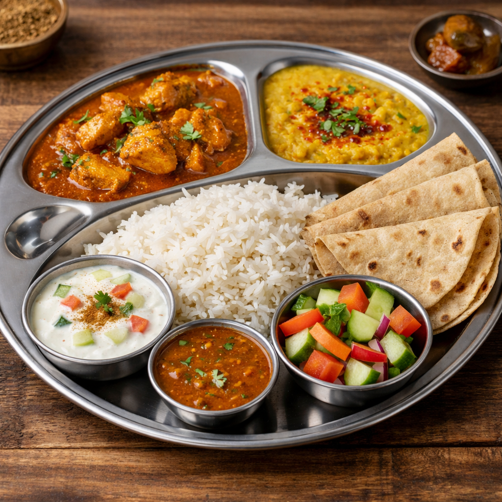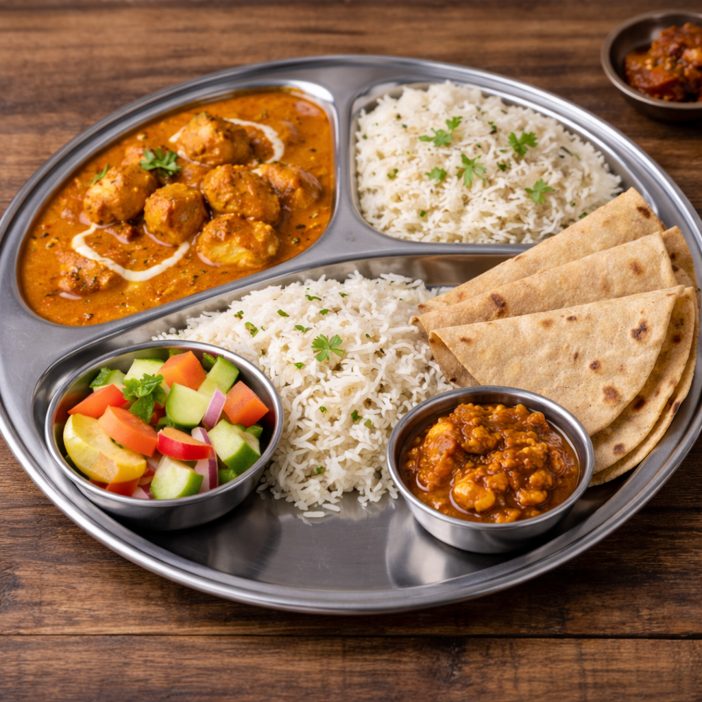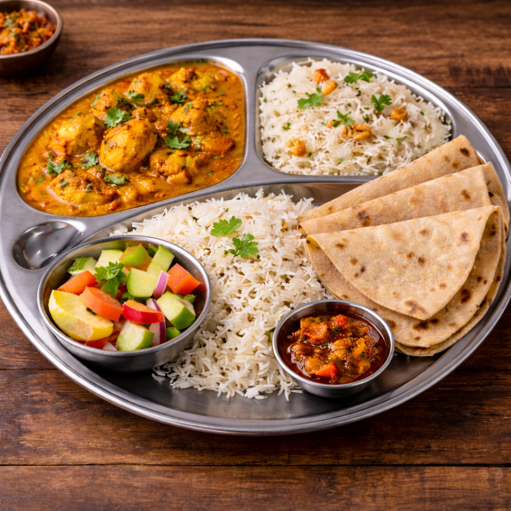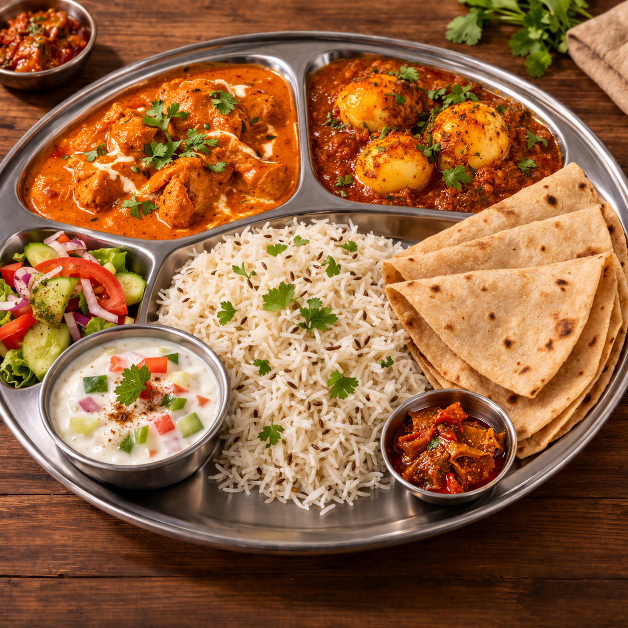 Butter Chicken, Egg Masala, Jeera Rice, 3 Chapati, Raita, Salad, Pickle