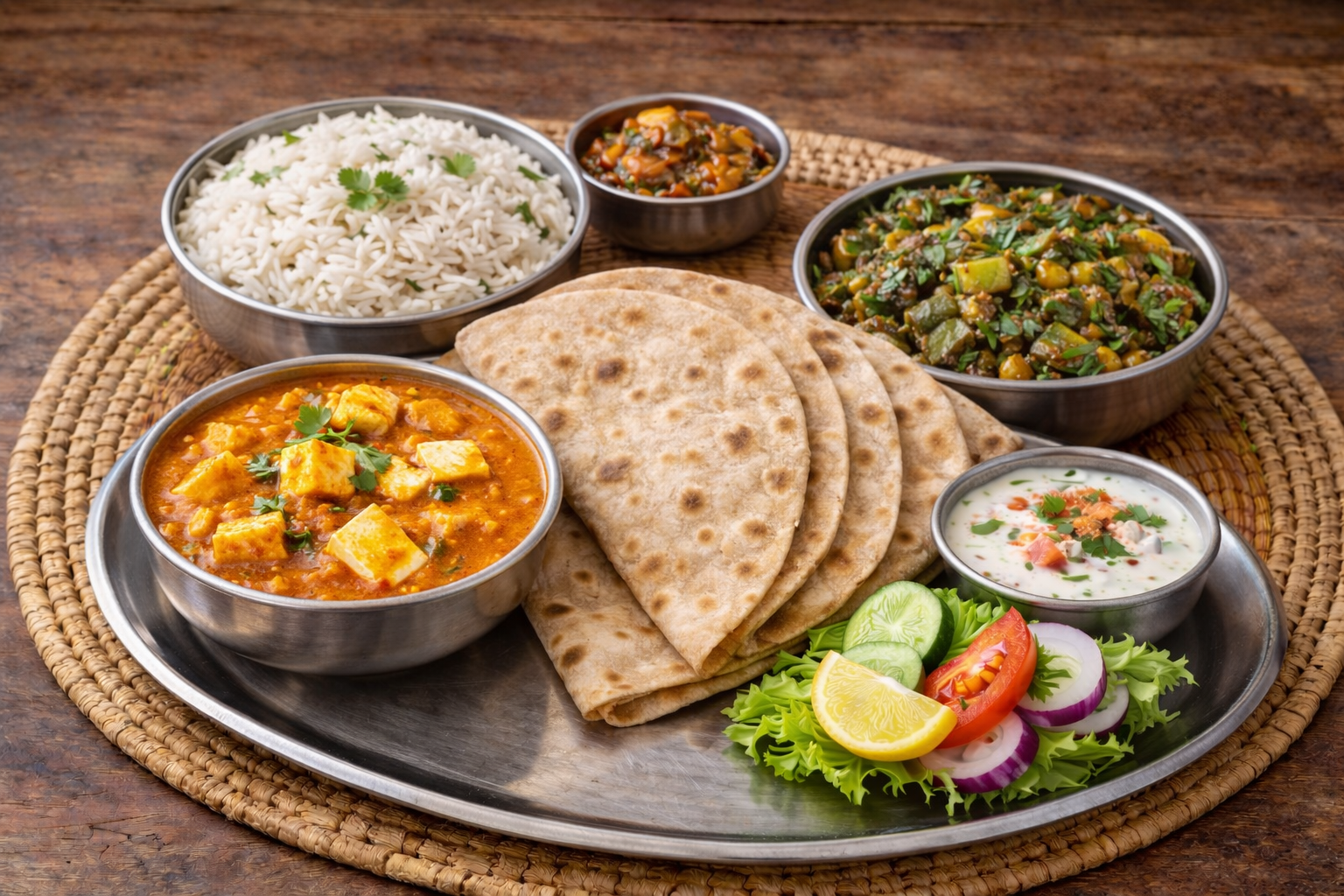 A special veg combination with Paneer Butter Masala and Bhindi Masala, served with Jeera Rice, 3 Chapati, Raita, Salad, and Pickle.