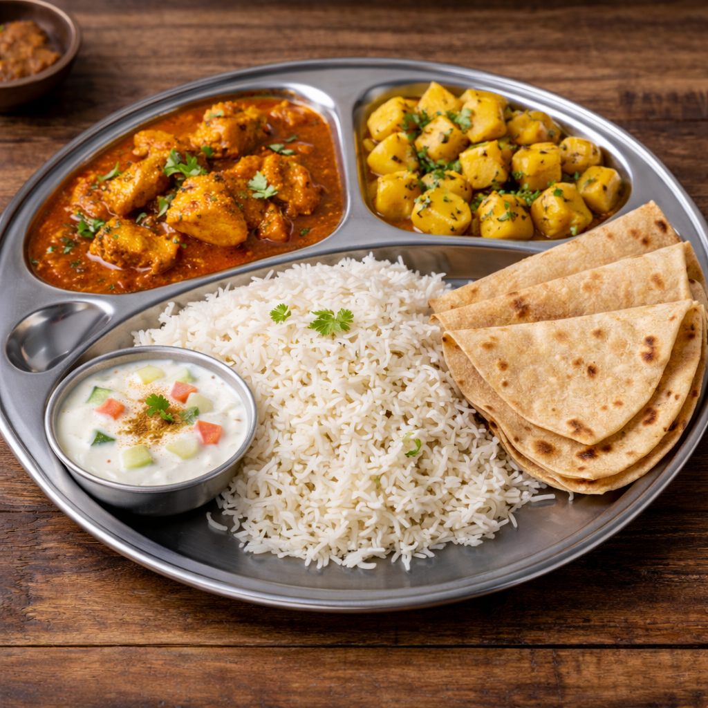 Chicken Curry, Aloo Jeera, Plain Rice, 3 Chapati, Raita