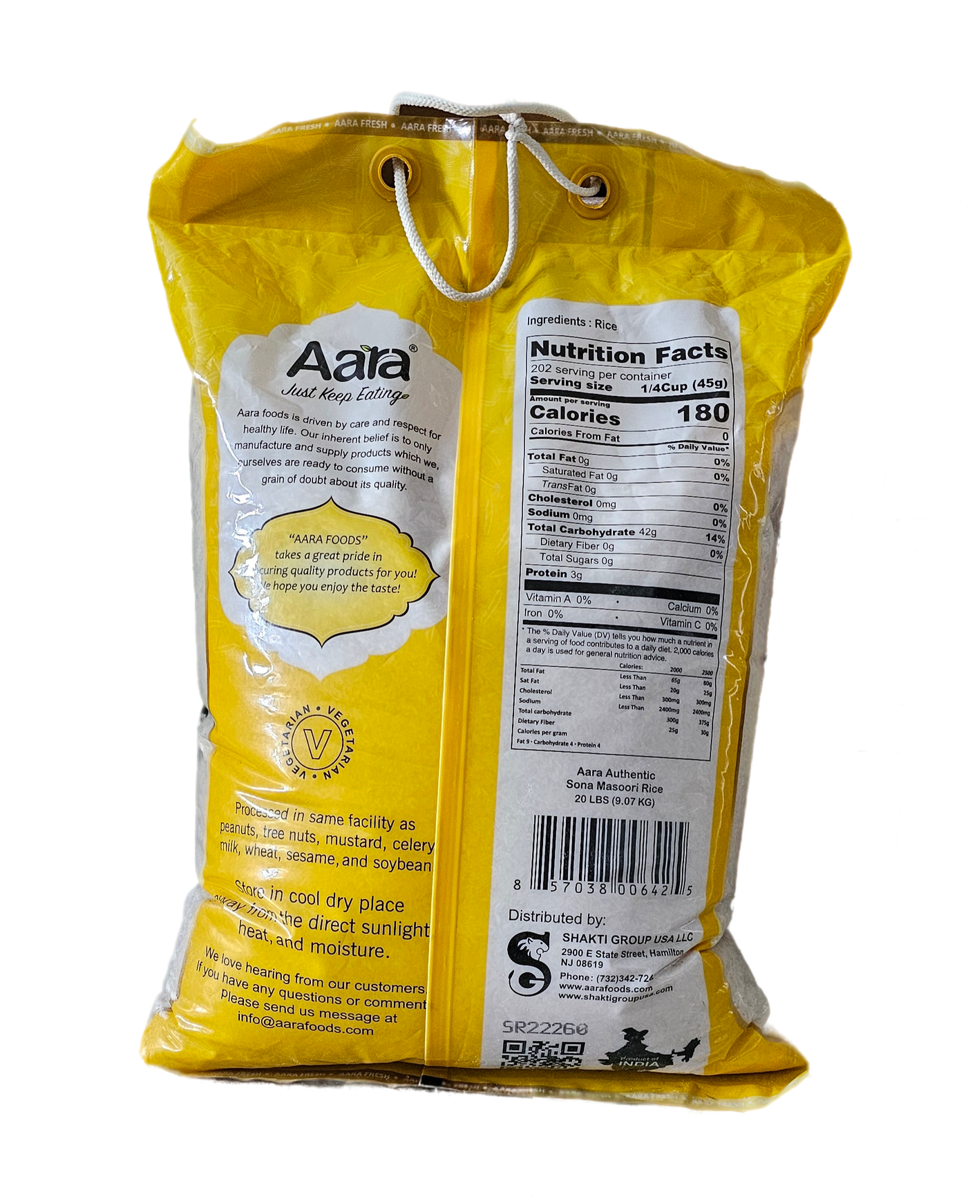 Aara’s 20Lb Sona Masoori Rice, perfect for a variety of dishes.