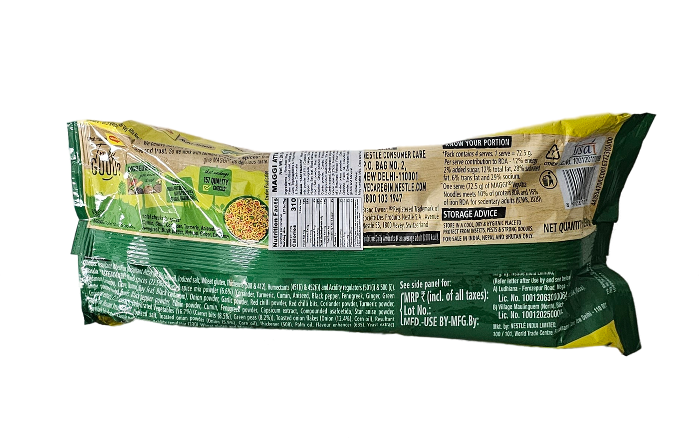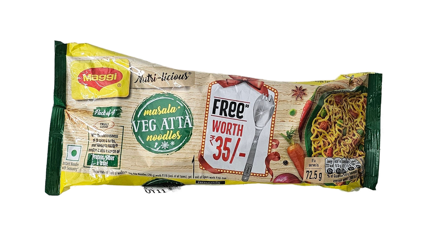 Enjoy the unique blend of spices and whole wheat with Maggi Masala Atta Noodles. This pack of 4 offers a quick, tasty meal, perfect for your hunger pangs. Indulge in its rich taste today!